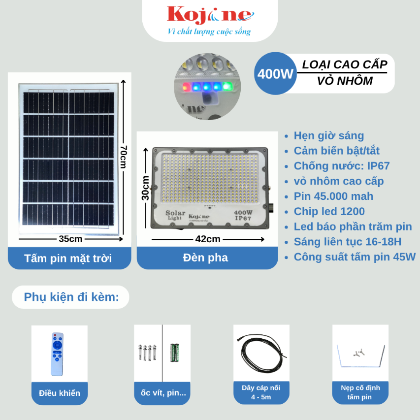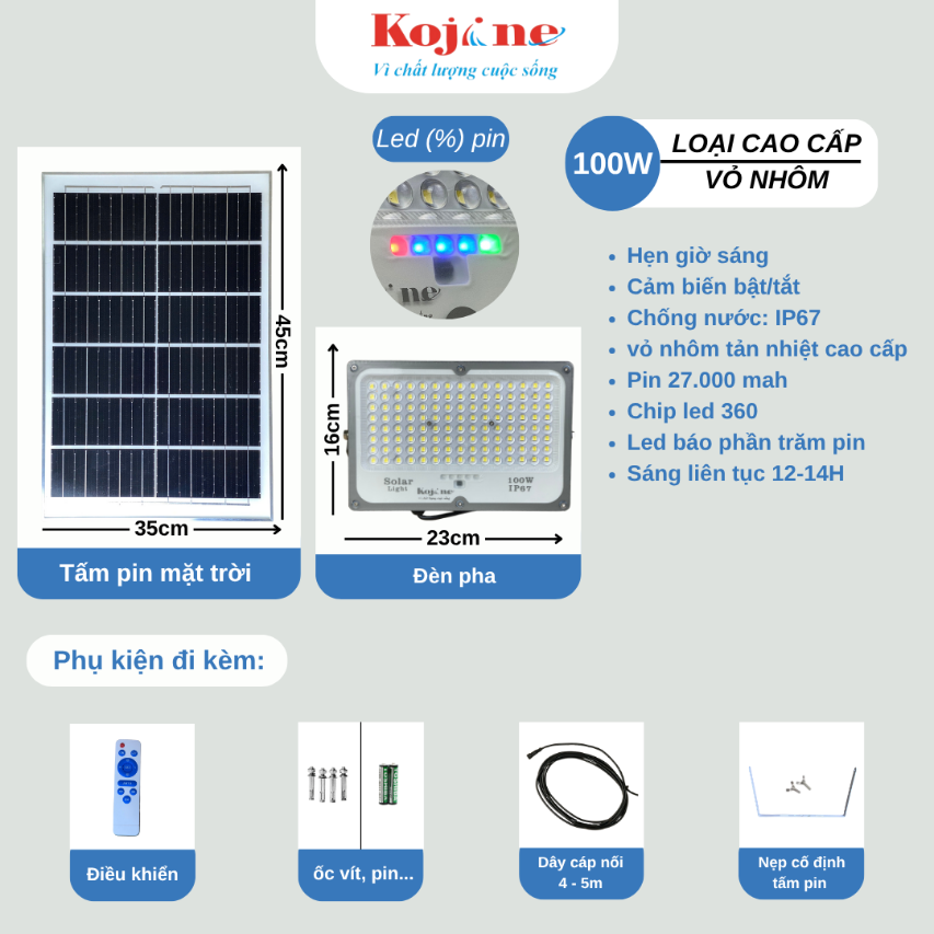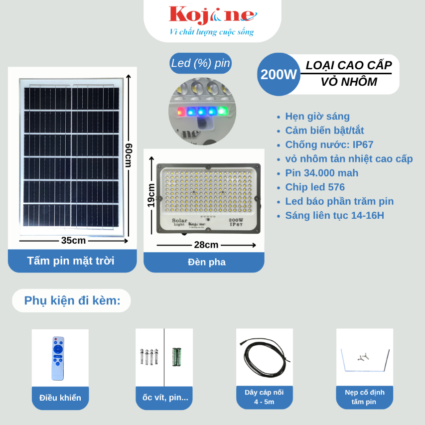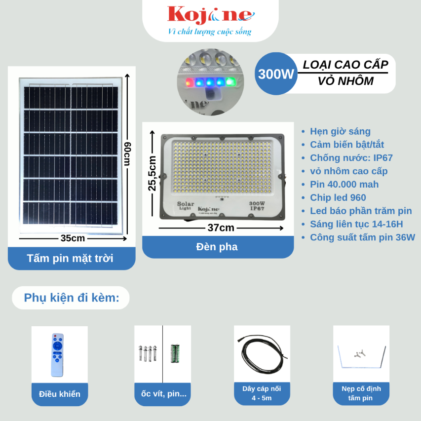 Đèn Pha Năng Lượng Mặt Trời Chip Led Thế Hệ Mới KOJINE, 100W / 200W / 300W /400W